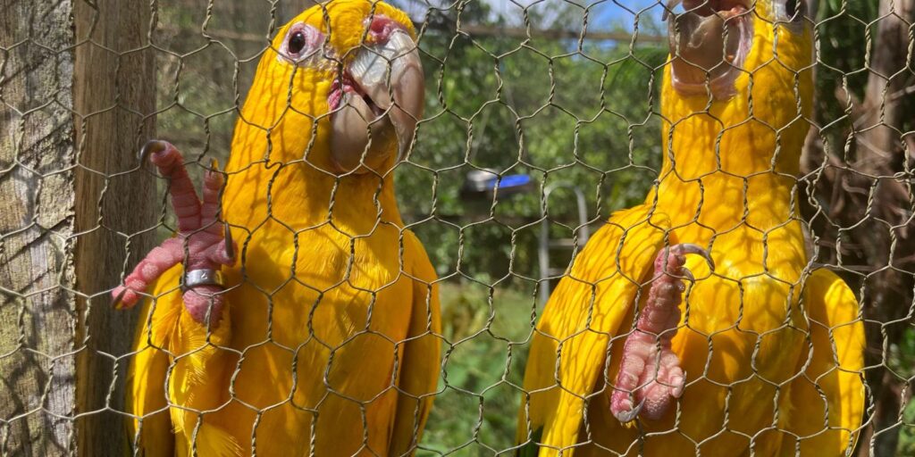 Esses dois indivíduos de ararajuba são vítimas de captura, posse irresponsável e tráfico de animais silvestres, que atingiu cerca de 13 milhões de espécimes de fauna e flora em 162 países, entre os anos de 2015 e 2021, segundo aponta o Relatório Global sobre Crimes contra Espécies Silvestres.